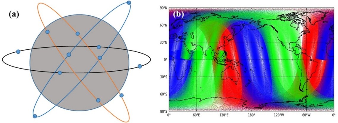 图 1 (a) 微小卫星星座概念图,及其 (b) 三条模拟轨道的辐射覆盖轨迹。