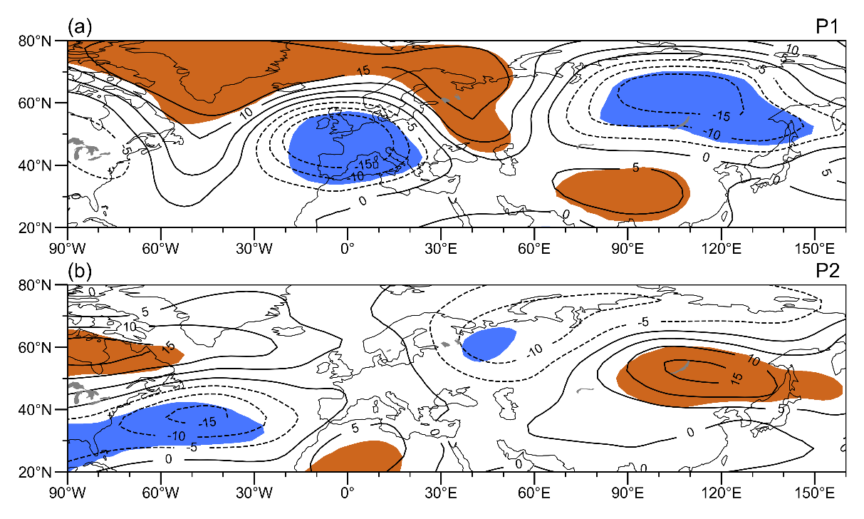 研究结果表明,秋季北大西洋马蹄型海温异常与冬季中国东北地区气温的年际关系在1990年发生了明显转折,在1961—1989年(P1时期),秋季北大西洋马蹄型海温异常到冬季衰减迅速,冬季北大西洋副极地海温异常表现为西暖东冷的特征,在北大西洋东部上空引起类似NAO负位相型的位势高度异常,乌拉尔山上空出现位势高度正异常,东北亚地区表现为位势高度负异常,有利于冬季中国东北地区气温异常偏低;而在1990—2020年(P2时期),秋季北大西洋马蹄型海温异常能维持到冬季,冬季北大西洋中高纬度海温异常表现为北暖南冷的特征,在北大西洋西部上空引起类似NAO负位相型的位势高度异常,乌拉尔山地区出现位势高度负异常,东北亚地区存在位势高度正异常,有利于冬季中国东北地区气温异常偏高。