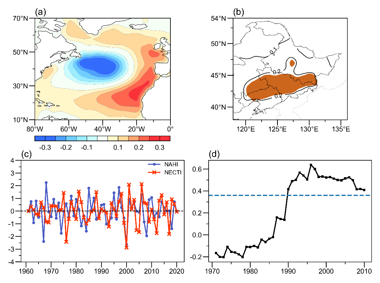 图1 (a)1961—2020年秋季北大西洋海温距平年际变率EOF分析第一模态空间分布 (b)秋季北大西洋马蹄型海温(NAH)指数与冬季中国东北气温的相关系数分布(c)秋季NAH指数(蓝)与冬季中国东北气温指数(红)时间序列(d)秋季NAH指数与冬季中国东北气温指数21年滑动相关(阴影区域/蓝色虚线均表示通过了90%置信水平的统计显著性检验)